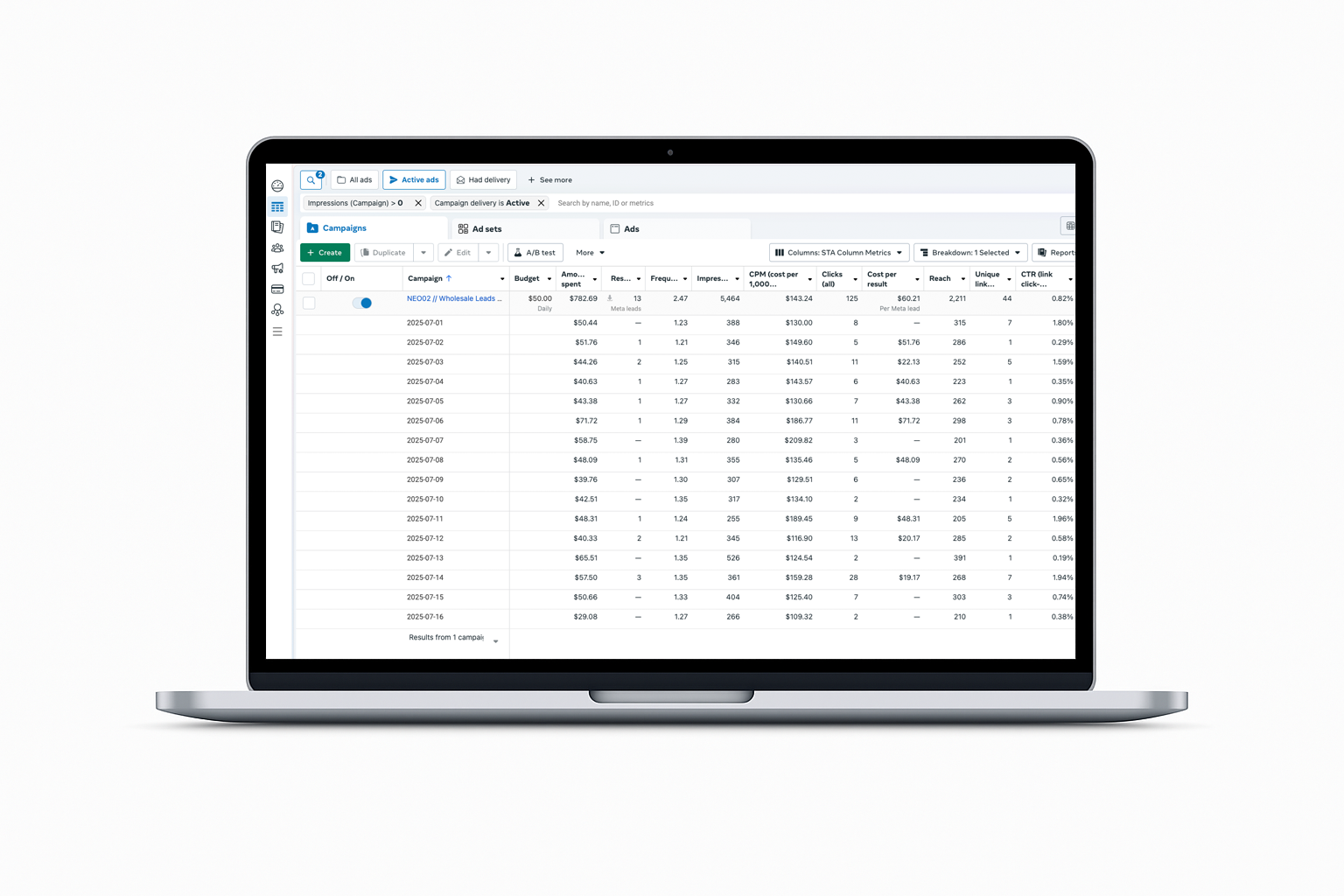 This is from a first-time wholesaler’s Meta campaign launched using our Lead Surge System™. We built it together using our plug-and-play templates, and the results came in within days.
